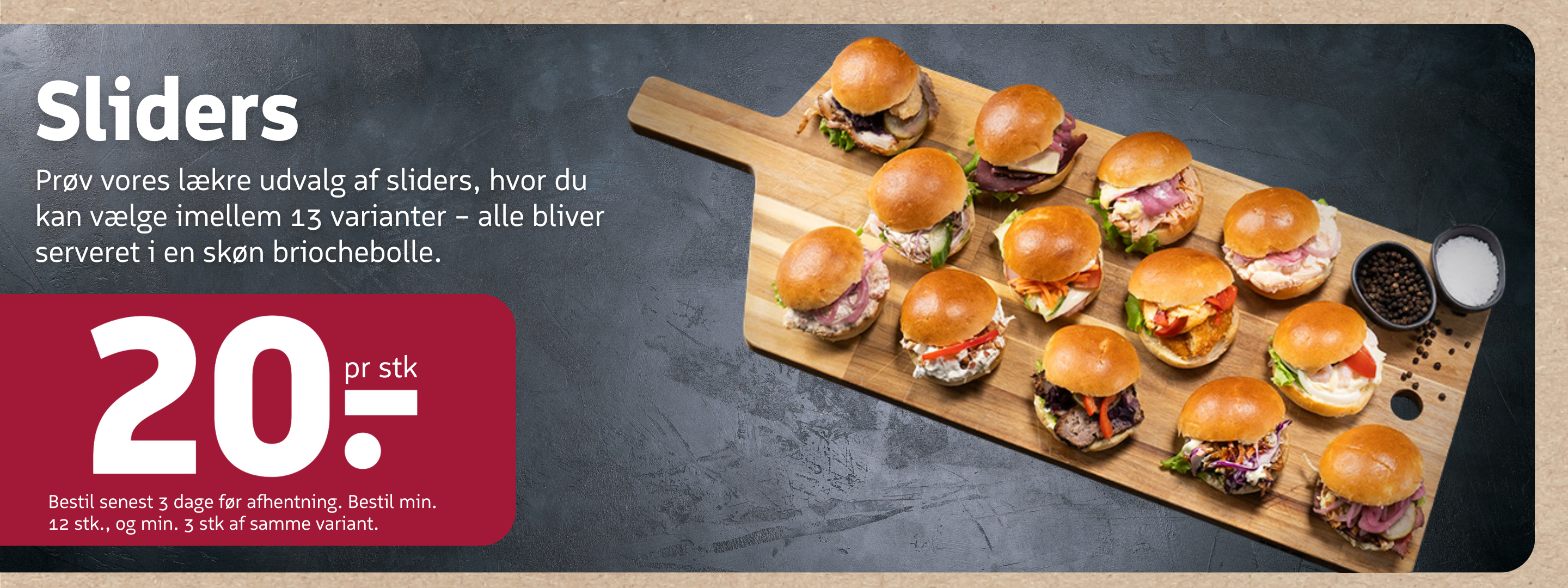 For at sikre, at du får den fulde smagsoplevelse, anbefaler vi at bestille 3 til 4 sliders pr. person, hvis de skal serveres som hovedret. Husk at bestille senest 3 dage før afhentning – minimum 12 stk. er påkrævet, og min. 3 stk af hver variant.